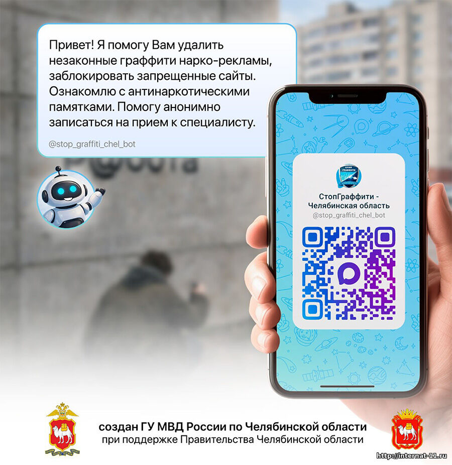 Управление наркоконтроля ГУ МВД России по Челябинской области совместно с Минцифры Челябинской области разработали чат-бот «СтопГраффити — Челябинская область», действующем в мессенджере «MAX». Бот представляет следующие возможности: