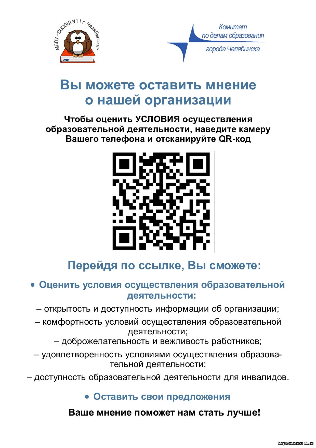 Опрос проводится в целях выявления мнения граждан о качестве условий осуществления образовательной деятельности организациями Челябинской области, осуществляющими образовательную деятельность по дошкольным, основным и дополнительным общеобразовательным программам, образовательным программам среднего профессионального образования.